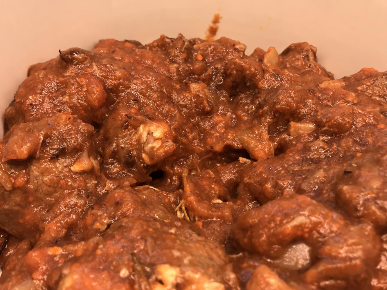 Aubergine farcie a la viande hachée, sauce tomate, basilic, parmesan et mozzarella.